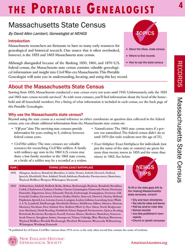Massachusetts researchers are fortunate to have so many early resources for genealogical and historical research. One source that is often overlooked, however, is the 1855 and 1865 Massachusetts state census....