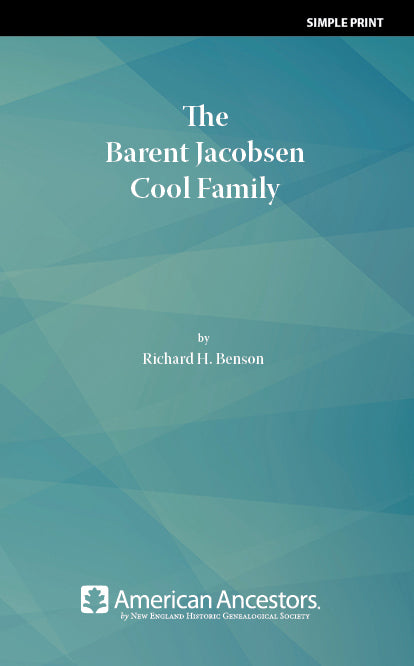 2017 reprint of 2001 original, as part of the NEHGS Simple Print program Author: Richard H. Benson Hardcover, 506 pages Barent Jacobsen Cool was born ca. 1610, probably in Amsterdam....